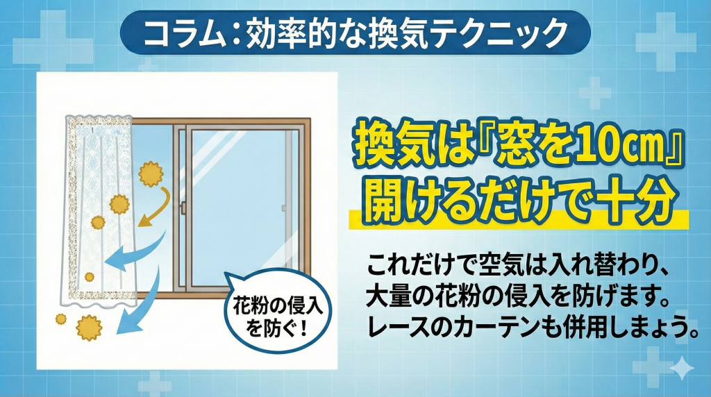 - レースのカーテンを活用: カーテンを閉めたまま換気をすることで、室内への花粉流入をさらに抑えられます。