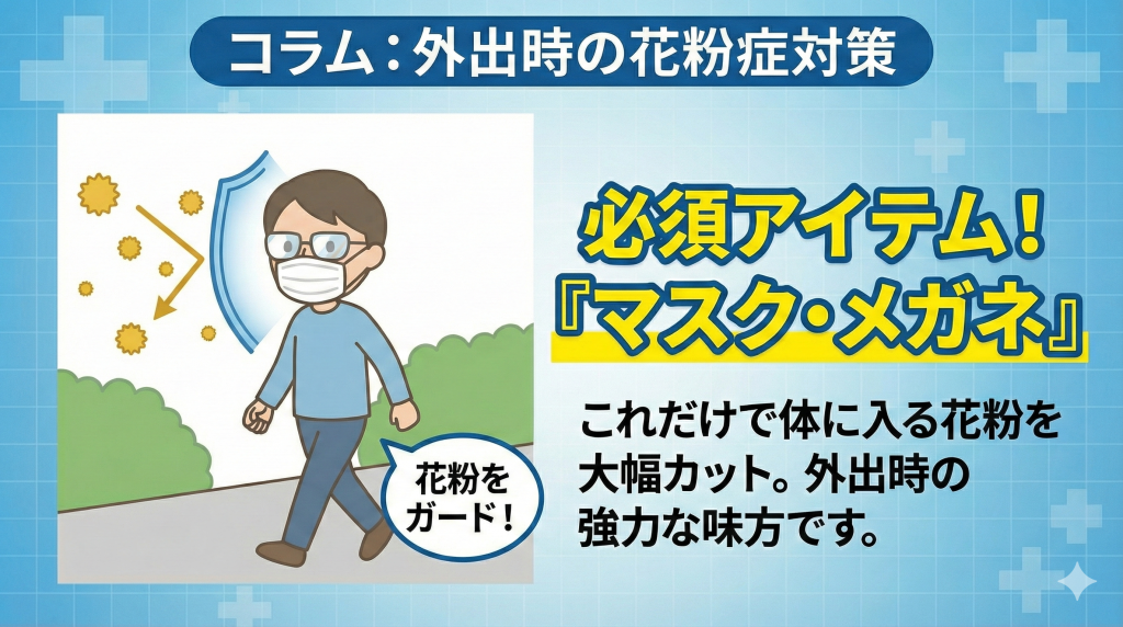 - メガネ: 花粉症用でなくても、通常のメガネをかけるだけで目に入る花粉を大幅にカットできます。