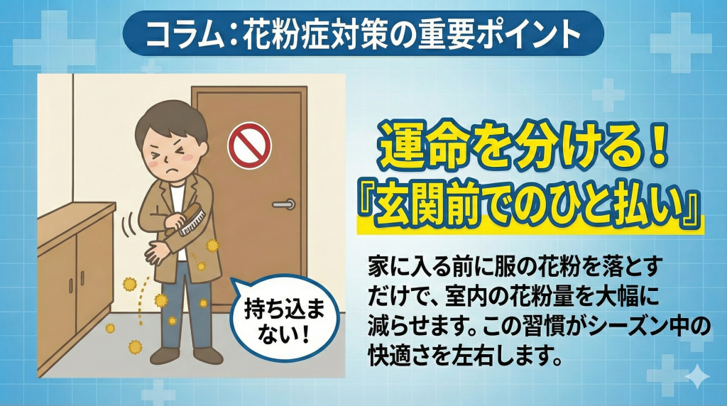 外から帰宅した際、そのまま家の中に入っていませんか? 実は、服に付着した花粉をそのまま持ち込むことが、室内での症状悪化の大きな原因です。