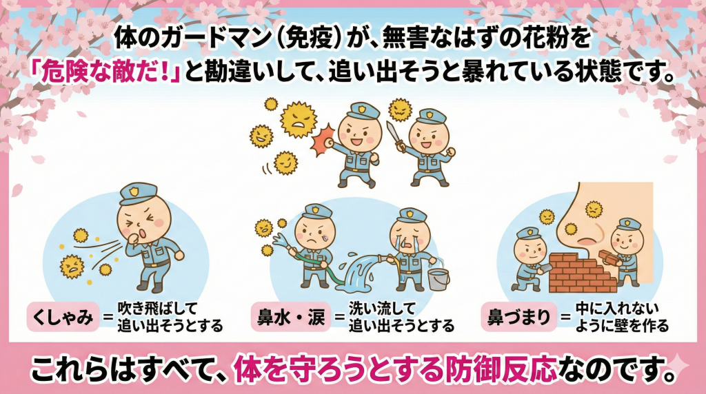 もう少し詳しく言うと、体のガードマン(免疫)が、無害なはずの花粉を「危険な敵だ!」と勘違いして、追い出そうと暴れている状態です。