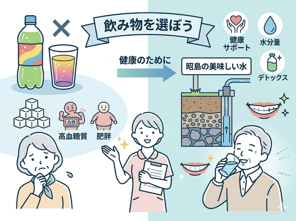 • 昭島の水」を最大の武器に: 昭島市は東京都で唯一、100%地下水(深層湧水)を水道水として使用している、世界に誇る「水の街」です。この美味しい水を積極的に活用しましょう。 市販の清涼飲料水やエナジードリンクには、驚くほど大量の砂糖(角砂糖10個分以上など)が含まれており、糖尿病悪化の元凶となります。昭島の美味しい水をマイボトルで持ち歩くことは、最も手軽で強力な糖尿病対策になります。