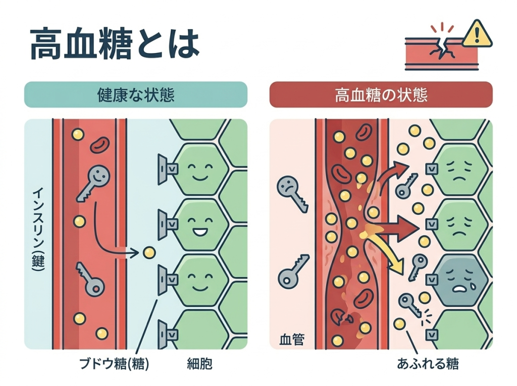 • 糖尿病の状態: インスリン(鍵)が足りない、あるいは鍵穴がサビて開かなくなると、糖が細胞に入れず血液中に溢れかえります。これが高血糖です。
